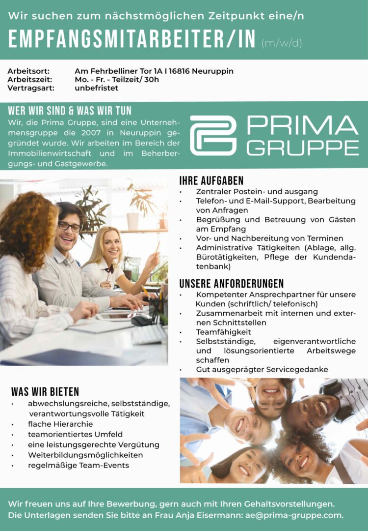 Wir sind immer auf der Suche nach motivierten, teamfähigen und ambitionierten Mitarbeitenden, die gemeinsam mit uns den Erfolg der Prima Gruppe voranbringen wollen.